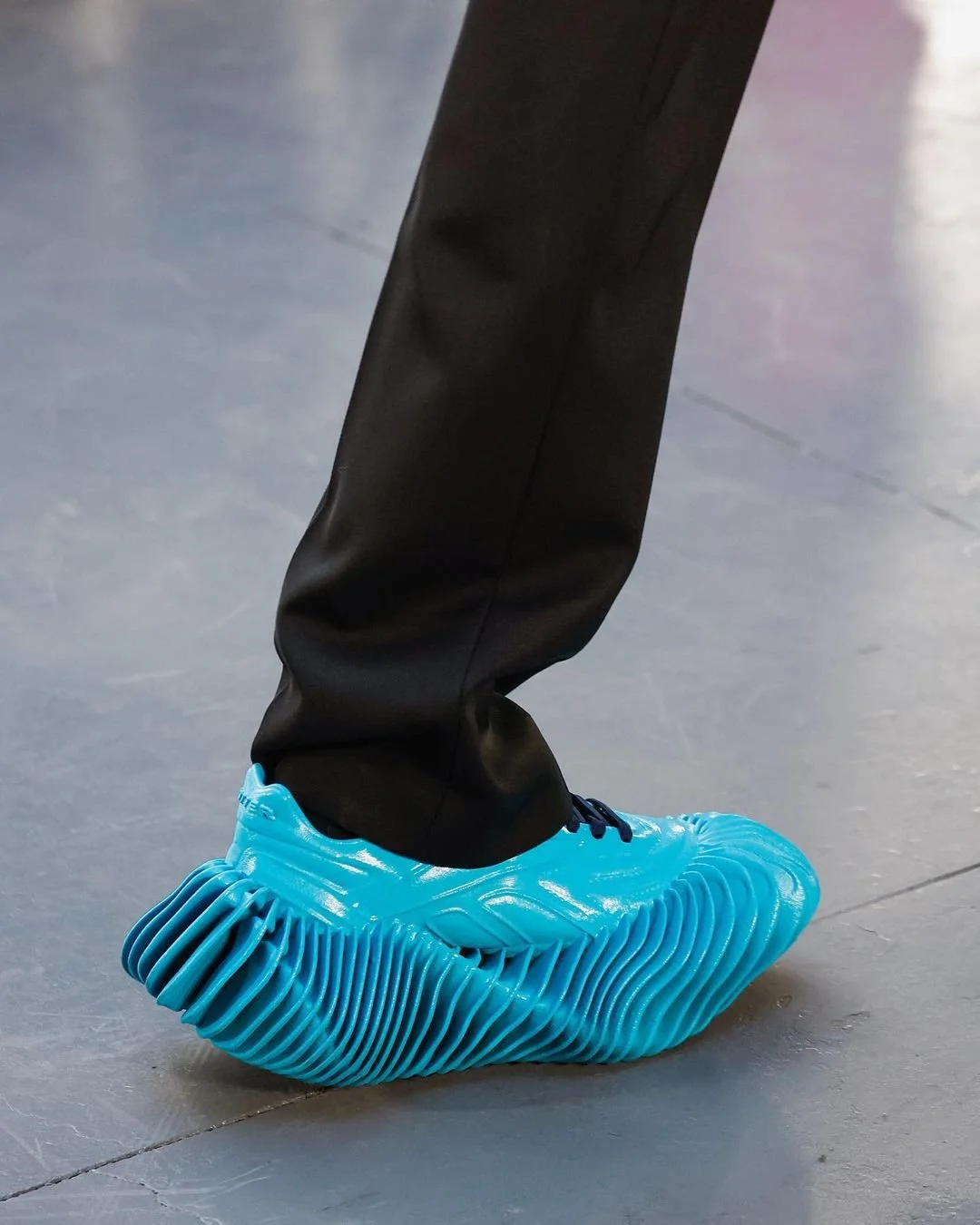 Material innovation comes from using kelp for knitwear and recycled bicycle seats as crossbody bags. But the surefire statement item was the 3D-printed sneaker developed with Reebok and inspired by the comb-like shape of the murex seashell.
